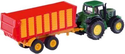 Bärenstarke Farmer-Kombination im kleinen Maßstab zum günstigen Preis. Der Silagewagen mit Tandem-Achs-Fahrwerk wird von einem wuchtigen John Deere Traktor der neuesten Baureihe gezogen. Die Klappe am Heck der Mulde ist zum Öffnen.