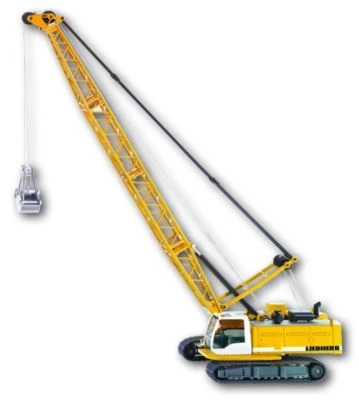Imposantes Baumaschinenmodell im kindgerechten Maßstab 1:87. Drehbarer Aufbau aus Metall. Kranarm nach oben und unten schwenkbar. Bewegliche Raupen aus Kunststoff. Kranhaken aus Metall, der mit einem Drehhebel gesenkt und gehoben werden kann.
