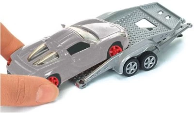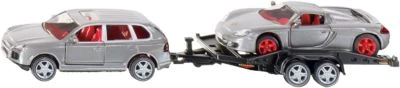 Porsche mit Transport- Anhänger aus der SIKU SUPER Serie. Kombination mit einem Porsche Cayenne Turbo als Zugfahrzeug sowie einem Porsche GT als Ladegut. Beide Porsche Modelle wurden drucktechnisch weiter veredelt. Eine optimale Beladung des weitgehend aus Metall gefertigten Tandem-Achs-Transportanhängers der Marke Böckmann ermöglicht eine kippbare Ladefläche.