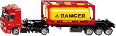 Flüssige Grundstoffe und Gase werden weltweit gehandelt, verarbeitet – und in Tankcontainern transportiert. Auf dem Frachter, auf der Schiene oder eben auf der Straße. Dort übernimmt der neue SIKU SUPER50 Mercedes-Benz Arocs mit einem dreiachsigen Sattelauflieger den Transport. Der Container ist in einem Rahmen gefasst und kann wie das Original abgeladen und gestapelt werden. Die Klappen der Befüllstutzen lassen sich öffnen und der Tank mit Wasser füllen. Der Rahmen des Sattelaufliegers ist verlängerbar, dann können zwei Container transportiert werden. Und auch die Zugmaschine begeistert mit einer Funktion. Das Führerhaus lässt sich nach vorne kippen und gibt den Blick auf den leistungsstarken Dieselmotor frei.