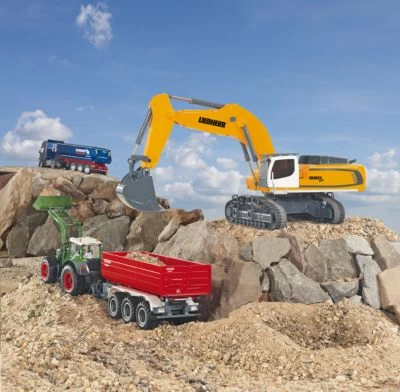 Etwas Großes rollt auf Ketten in die Kinderzimmer-Baustelle. Der neue Raupenbagger der Marke Liebherr setzt in der SIKUCONTROL32-Serie neue Maßstäbe in Größe, Gewicht und Funktionalität. Das aus Metall und Kunststoff gefertigte 2,4 GHz-RC-Modell, bringt ein Gewicht von mehr als 2 kg auf die Waage. Insgesamt sechs elektronisch-proportional gesteuerte Hochleistungsgetriebe bewegen dieses monumentale RC-Fahrzeug sicher und präzise zum Ziel. Die rechte und linke Seite des Raupenfahrwerks ist einzeln proportional steuerbar um den Bagger präzise an die gewünschte Stelle zu manövrieren. Der Oberwagen kann um 360 Grad und mehr gedreht werden, da dieser kabellos auf einem Schleifringträger läuft. Die Frage, wo bei dem Bagger vorne ist, wenn während des konzentrierten Baggerns der Oberwagen mehrfach gedreht wird, ist hin und wieder nicht so leicht zu beantworten. Hier hilft die Elektronik weiter. Mit einem Tastendruck wird der Oberwagen in die „Normalstellung“ gefahren. Das bedeutet: Dort wo der Baggerarm hinzeigt ist vorne. Der Baggerarm wird mit drei Getrieben proportional gesteuert und ist in der Lage, originalgetreu zu baggern, auch unterhalb der Bodenlinie. Somit ist das Ausschachten von Löchern möglich. Gesteuert wird der Bagger über eine Fernsteuerung. Mit dieser Kommandozentrale hat der Baggerfahrer alle Funktionen im Griff. Die neuen Joystick-Steuerelemente bilden die realen Steuerbewegungen eines Baggers originalgetreu ab. Präzise Steuerbefehle zum baggern, befestigen, verteilen und abbrechen sind mit der neuen Steuerung problemlos möglich. Zur Sicherheit beim Betrieb des Modells als auch zur Vermeidung von Beschädigungen sind die sechs Getriebe jeweils mit Rutschkupplungen ausgestattet. Eine LED-basierte Beleuchtung rundet das optisch wie technisch herausragende Modell ab.