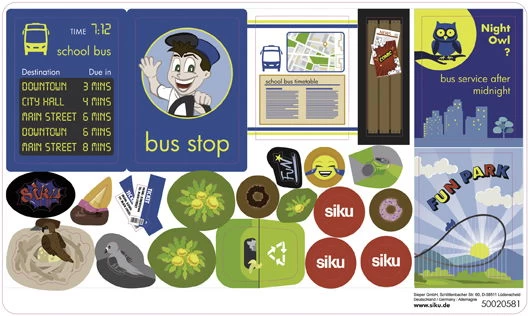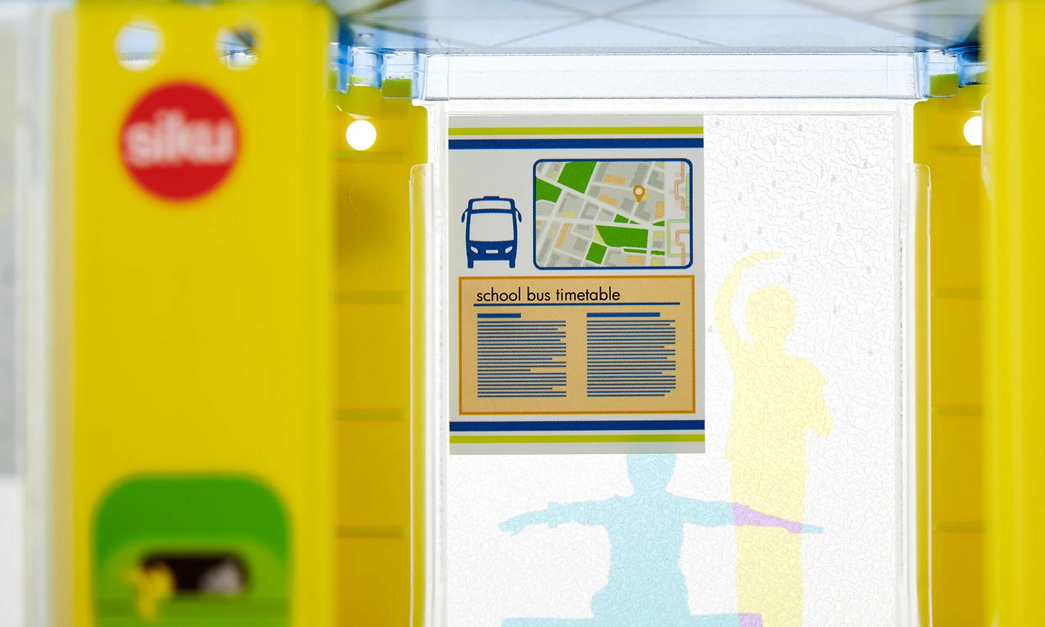 Geschützt warten auf den Schulbus Regen, Schnee und Kälte: Manchmal ist das Wetter beim Warten auf den Schulbus unangenehm. In der SIKUWORLD steht nun eine neue, schicke Haltestelle mit transparentem Dach und Wänden. Zwei große Lampen leuchten die Haltestelle auch im Dunklen aus. Die Haltestelle ist mit dem Fahrkartenautomaten, einem Werbeschild und einer Notrufsäule sehr detailliert bespielbar. Die Zeit vergeht schnell: Ah, und da kommt schon der hellblaue Schulbus mit der farbigen Bedruckung. Enthalten ist bereits ein Mercedes-Benz Sprinter. Die Haltstelle ist auch ideal zu kombinieren mit den siku Bussen und Straßenbahnen oder kann als Kreuzfahrtterminal genutzt werden. Bustickets zum Ausfüllen werden auf der Website zum Download angeboten.