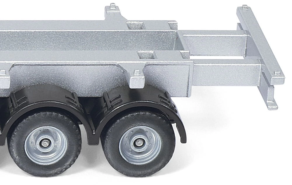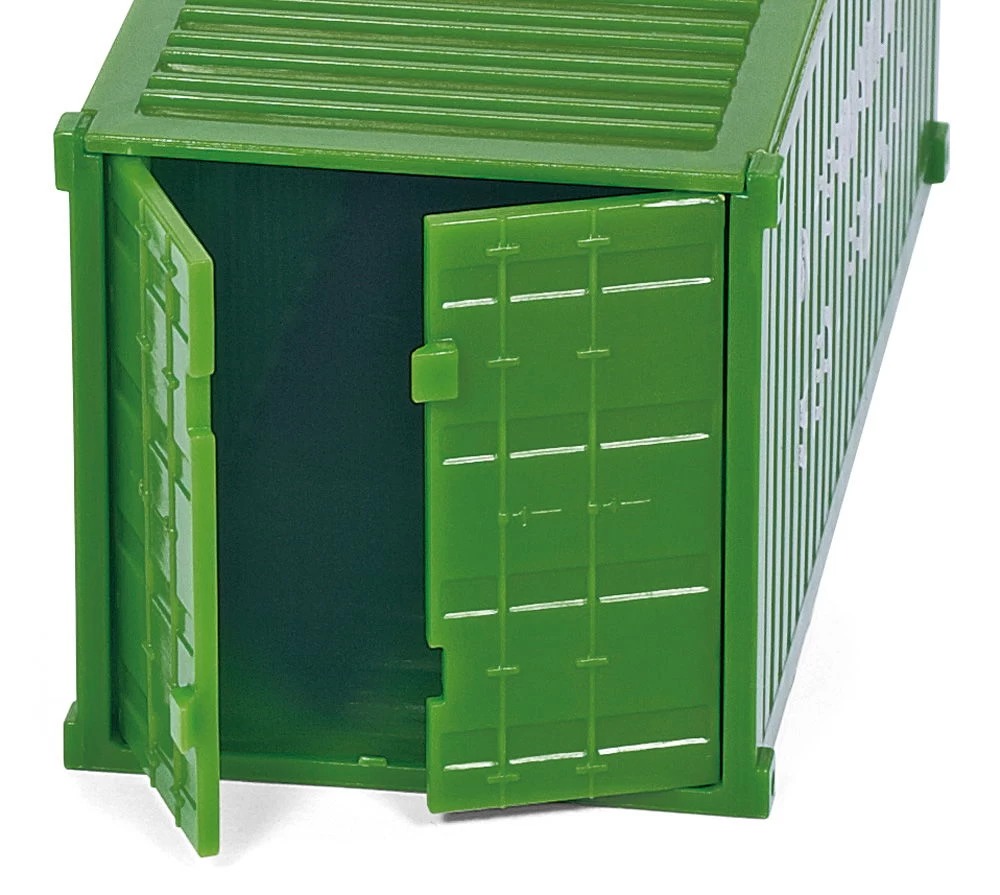 Produkte aller Art werden mit Überseecontainern durch die ganze Welt transportiert. Den Weg über die Straße nehmen die Container auf LKW mit speziellen Aufliegern. Dieses Thema setzt SIKU spielstark mit dem neuen Transportgespann des Mercedes-Benz Actros mit 2 Containern um. Der variable Auflieger lässt sich, je nach Beladung mit einem oder zwei Containern, in der Länge variieren. Wird nur ein Container gefahren, kann der hintere Teil des Aufliegerrahmens herein geschoben werden, damit der Container gewichtsoptimal mittig platziert werden kann. Die Container sind mit beweglichen Toren ausgestattet, die eine komfortable Be- und Entladung zulassen.