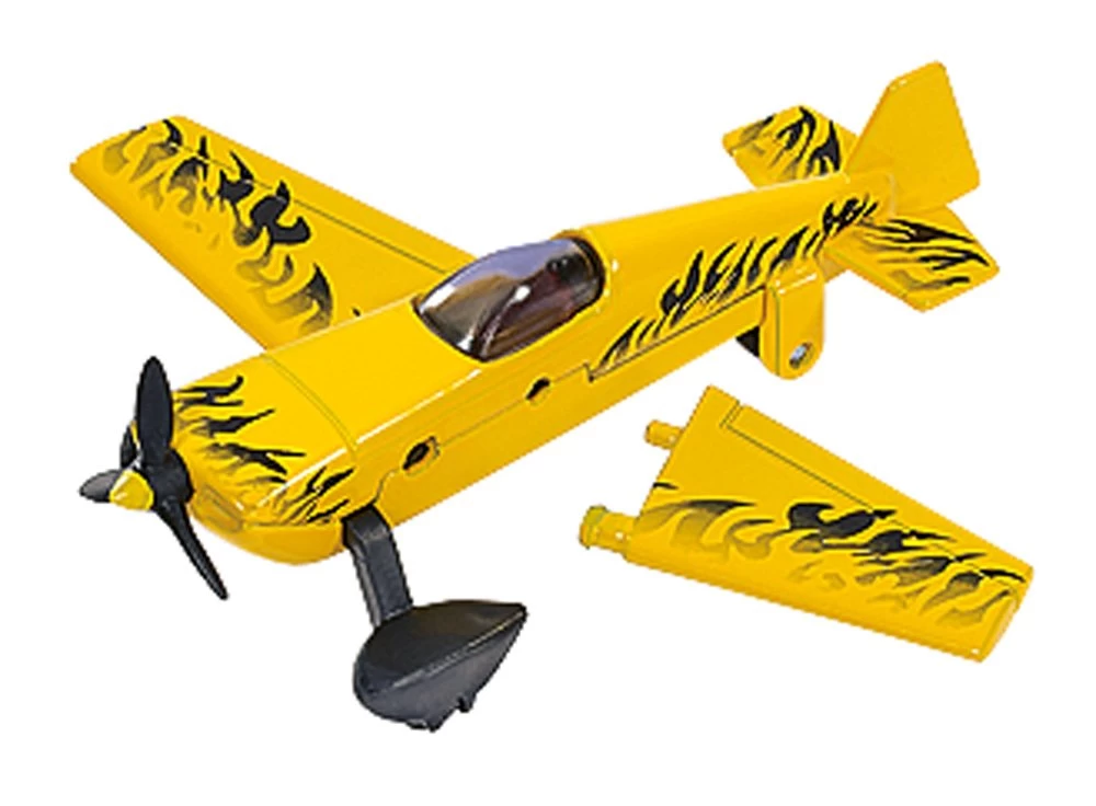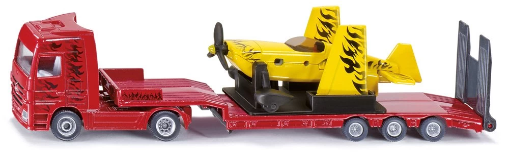 Sattelzugmaschine aus Metall auf Basis der neuesten Mercedes Actros Mega-Space-Fahrerkabine als Zugfahrzeug für einen drei-Achs-Tieflader mit Sportflugzeug.Das detailliert ausgeführte Metallflugzeug mit beweglichem Rotor, drehbaren Rädern und abnehmbaren Flügeln liegt gut in der Hand und ist bereit für Flugmanöver jeder Art.