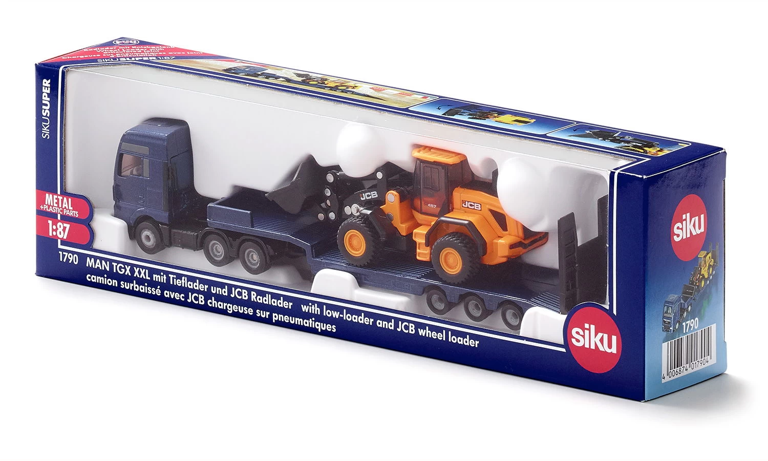 Mit schwerer Last zur BaustelleScheinbar leicht zieht die 3-Achs-Zugmaschine den JCB Radlader auf dem 3-Achs-Tieflader zur nächsten Baustelle. Die Lkw-Räder mit Reifen aus gummiertem Material finden auch abseits der Straße genügend Halt. Zeit zum Abladen: Die Auffahrrampe lässt sich klappen und der schwere JCB Radlader rollt langsam rückwärts. Das Fahrerhaus der MAN TGX-Baureihe und der Tieflader sind für den harten Baustelleinsatz aus Metall gefertigt. Der Ladearm und die mächtige Baggerschaufel des Radladers sind beweglich und gehen nach dem Abladen sofort in Arbeitsposition.