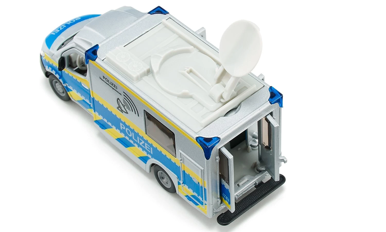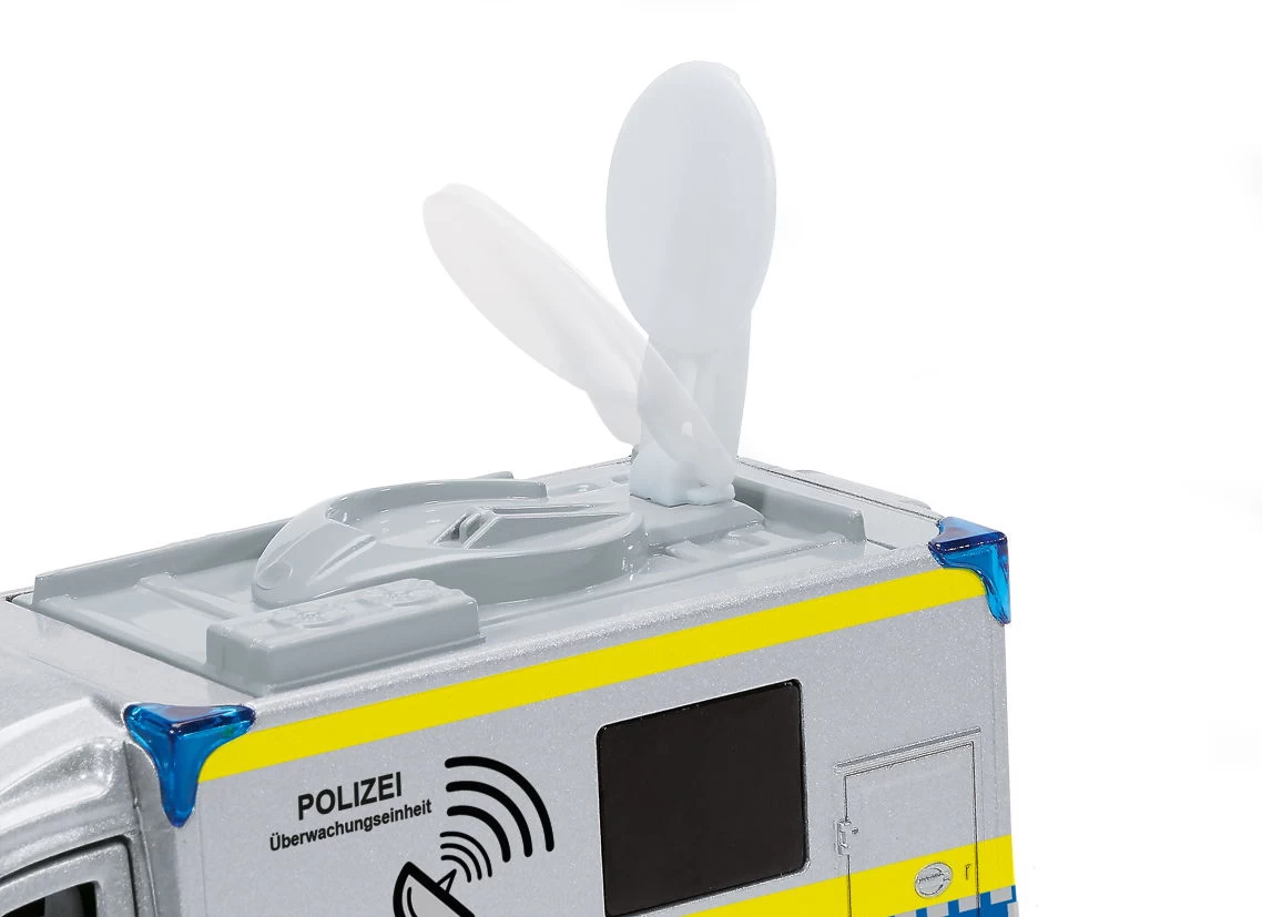 Je komplexer der Polizeieinsatz, desto wichtiger ist eine zuverlässige Kommunikation zwischen den Einsatzkräften. Per Satellitenfunk funktioniert der Austausch auch in Krisenlagen oder Katastrophensituationen schnell und reibungslos. Mit entsprechender Ausrüstung ausgestattet ist der siku-Polizeisprinters von Mercedes Benz. Auf seinem Dach befindet sich eine drehbare Satellitenschüssel, die während der Fahrt eingeklappt werden kann. Sowohl die Türen auf beiden Seiten der Fahrerkabine als auch jeweils zwei Türen auf der rechten Seite und am Heck lassen sich öffnen. Die Ecken des Kofferaufbaus markieren vier Blaulichter. Die typische silber-blaue Farbgebung des Polizei-Sprinters wird ergänzt durch rundumlaufende gelbe Signalstreifen sowie die Schriftzüge „Polizei“ und „Polizei Überwachungseinheit“.