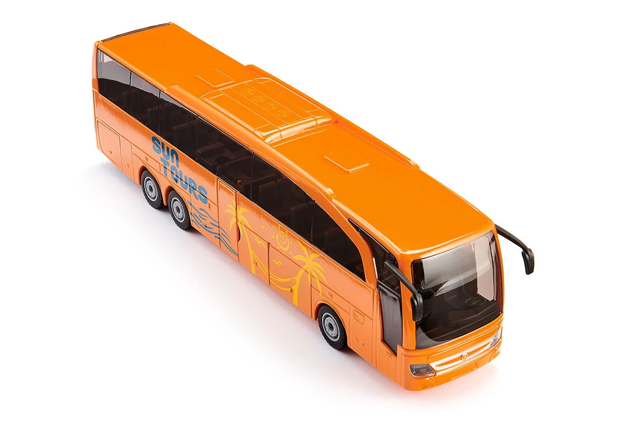 Mit dem Reisebus in die Urlaubs-Sonne. Der neue Travego von Mercedes-Benz fährt sicher und komfortabel Passagiere und Gepäck an die sonnigen Strände. Das bequeme Ein- und Aussteigen ist durch die elegant zu öffnenden Türen möglich. Gepäck wird im Kofferabteil verstaut, welches rechts und links durch große, zu öffnende, Klappen zugänglich ist. Die sechs gummierten Reifen, montiert auf drei Achsen, sorgen für eine ruhige Fahrt. Die farbenfrohe und sonnige Lackierung des Busses zeigt die Vorfreude auf den Sommerurlaub. Dieses Busmodell wird auch von der deutschen Fußball-Nationalmannschaft genutzt.