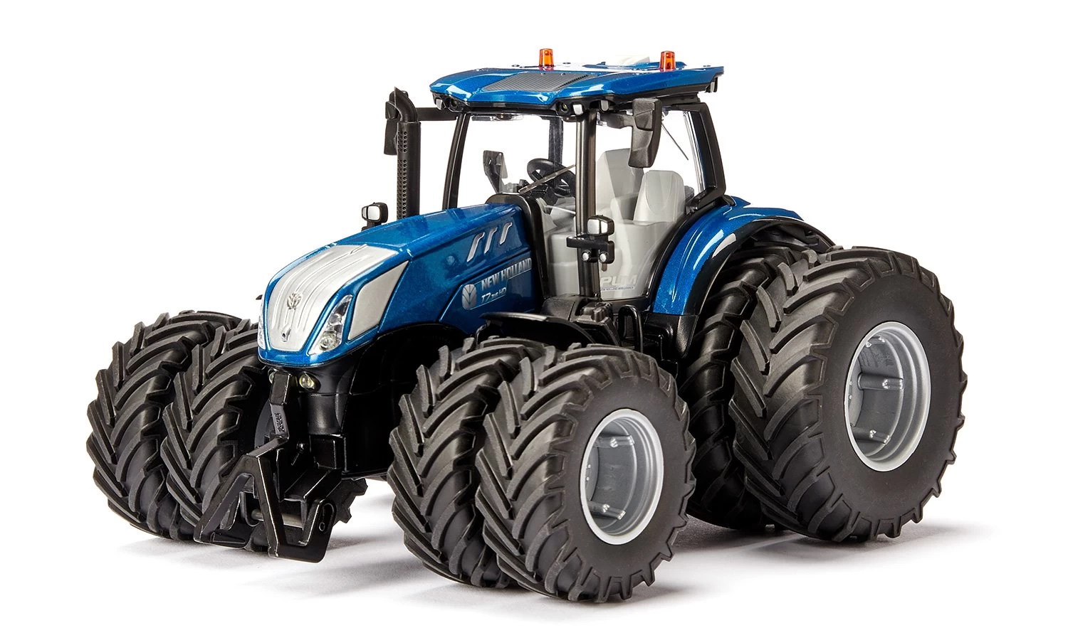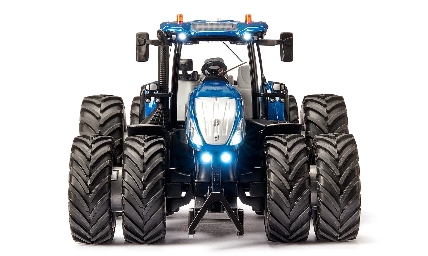 Vielseitigkeit und Stärke – dafür steht der moderne T7 Heavy Duty von New Holland. Mehr Leistung, mehr Hubkraft, mehr Flexibilität, mehr Komfort – der Premium-Traktor der 7er Baureihe wurde für moderne Landwirtschaftsbetriebe mit höchsten Ansprüchen konzipiert. Bis zu 315 PS lassen sich beim T7 für den Einsatz von schwersten Arbeitsgeräten abrufen. Das Spitzenmodell unter den Großtraktoren ist stark genug für Zugarbeiten, Bodenbearbeitung, Ballenpressen und Transporte. Mit Bluetooth-Steuerung bietet der New Holland T7 von SIKU CONTROL abwechslungsreichen Spielspaß. Seine Karosserie ist aus Metall, der Innenraum der verglasten Kabine detailgetreu gestaltet. Auch optisch macht der Großtraktor aus der SIKU CONTROL-Serie richtig Eindruck: Die Sonderfarbe Dunkelblaumetallic von New Holland und die silbernen Felgen betonen sein modernes Design. Ein Highlight sind die magnetischen Doppelreifen, die dem Modell zusätzliche Stabilität und eine besonders voluminöse Optik verleihen. Durch die integrierten Magnete können die Räder kinderleicht montiert und wieder abgenommen werden. Mit der SIKU CONTROL-App lassen sich mit Smartphone oder Tablet die drei Getriebe, die 12 LEDs und die zahlreichen Funktionen des Traktors bedienen. Fahr- und Lenkfunktionen werden proportional gesteuert – wahlweise über die virtuelle Gamepad-Steuerung oder die Bewegungssensoren der mobilen Geräte. Die SIKU CONTROL-App kann kostenlos im App Store und im Google Play Store heruntergeladen werden. Einstellungen und Funktionen der App werden laufend aktualisiert. Mit der OTA (Over-The-Air)-Funktion werden alle Updates für das Modell über den Systemstart der App automatisch geladen. Zur Energieversorgung benötigt der fernsteuerbare Traktor drei AAA-Batterien. Durch die siku-Standardkupplungen vorne und am Heck kann der New Holland-Traktor mit sämtlichen Anhängern und Zubehör aus der siku Farmer-Serie kombiniert werden.