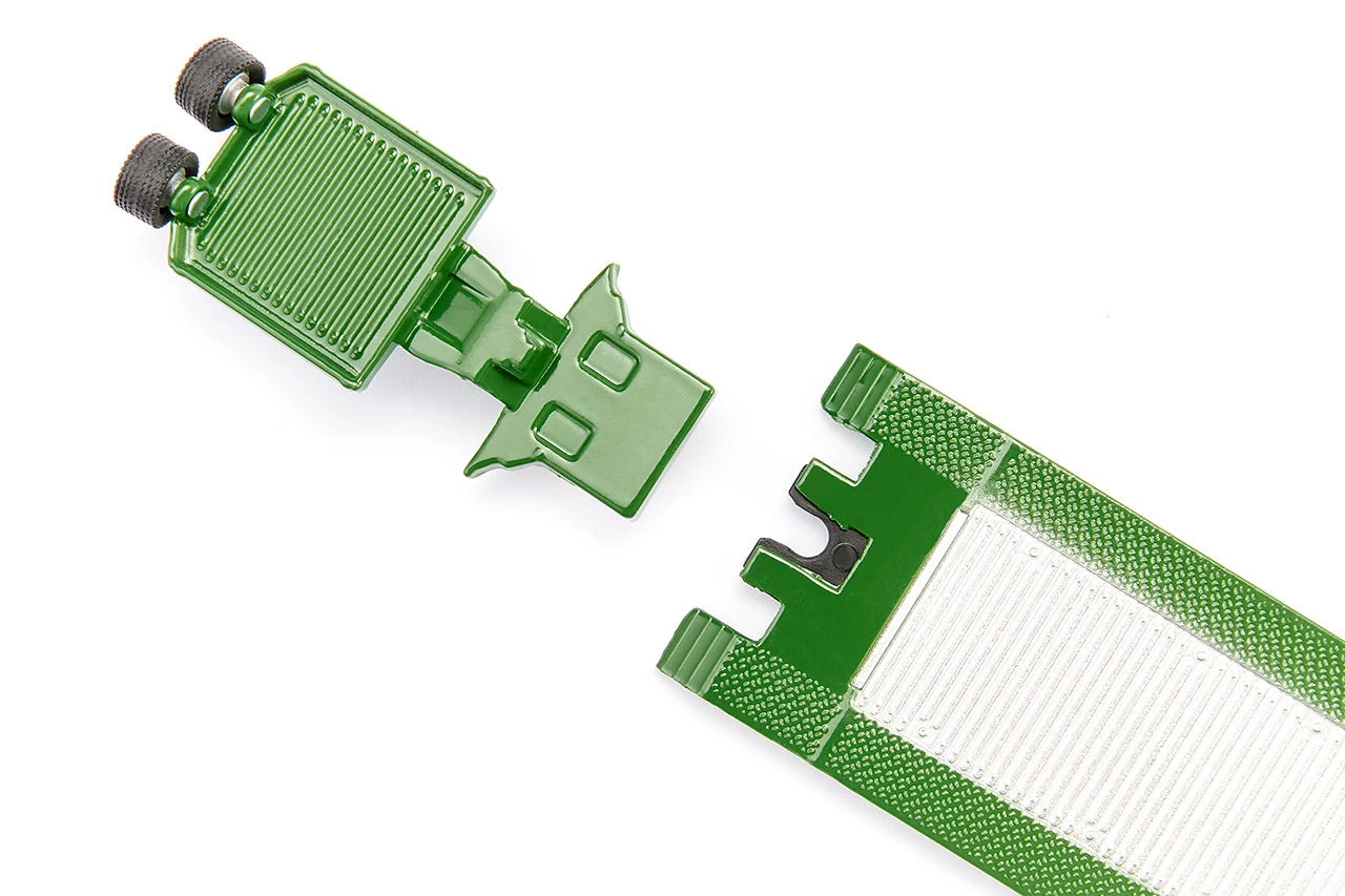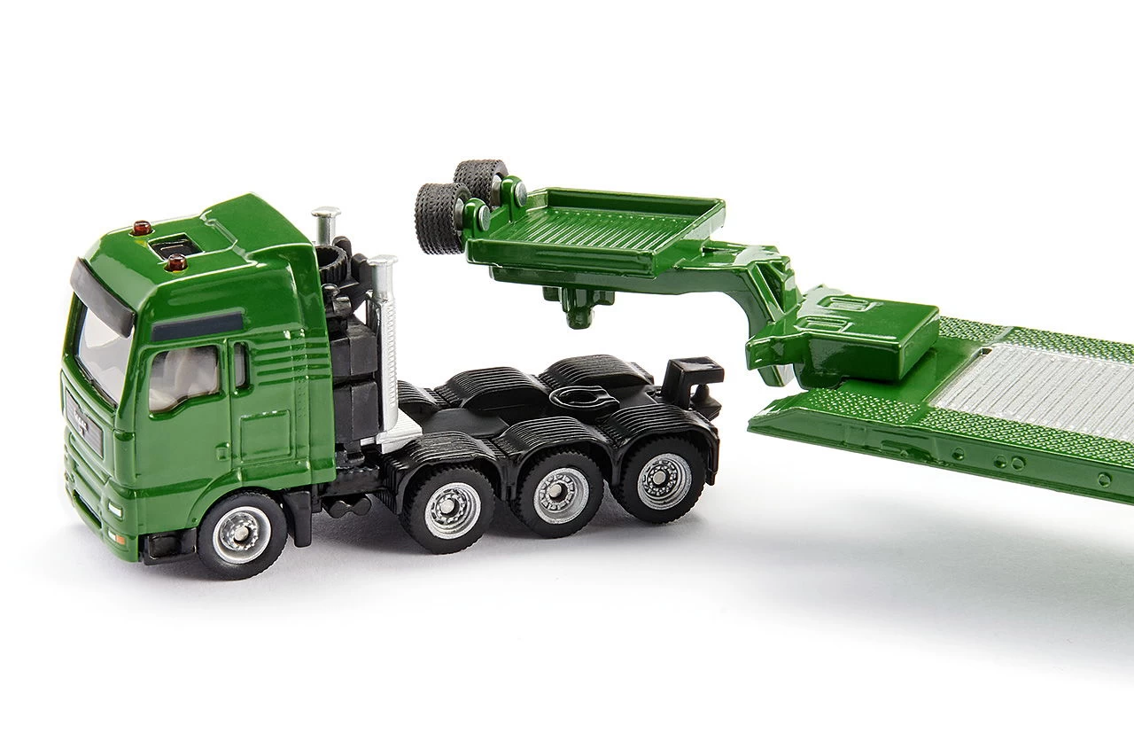 Mächtige Kombination bestehend aus einer MAN-4-Achs-Schwertransport-Zugmaschine, einem Tiefbettauflieger mit Schwanenhals, einem Liebherr-Seilbagger mit Abrissbirne und drei Verkehrszeichen. Die Modelle sind weitgehend aus Metall gefertigt. Der Auflieger ist abkoppelbar. Der Schwanenhals kann zur Beladung vom Tiefbett getrennt werden. Der Seilbagger mit beweglichen Raupenketten ist mit einer Abrissbirne ausgestattet. Das Maschinenhaus ist um 360 Grad drehbar. Der Ausleger ist in der Neigung verstellbar. Verkehrszeichen sind aus Kunststoff.