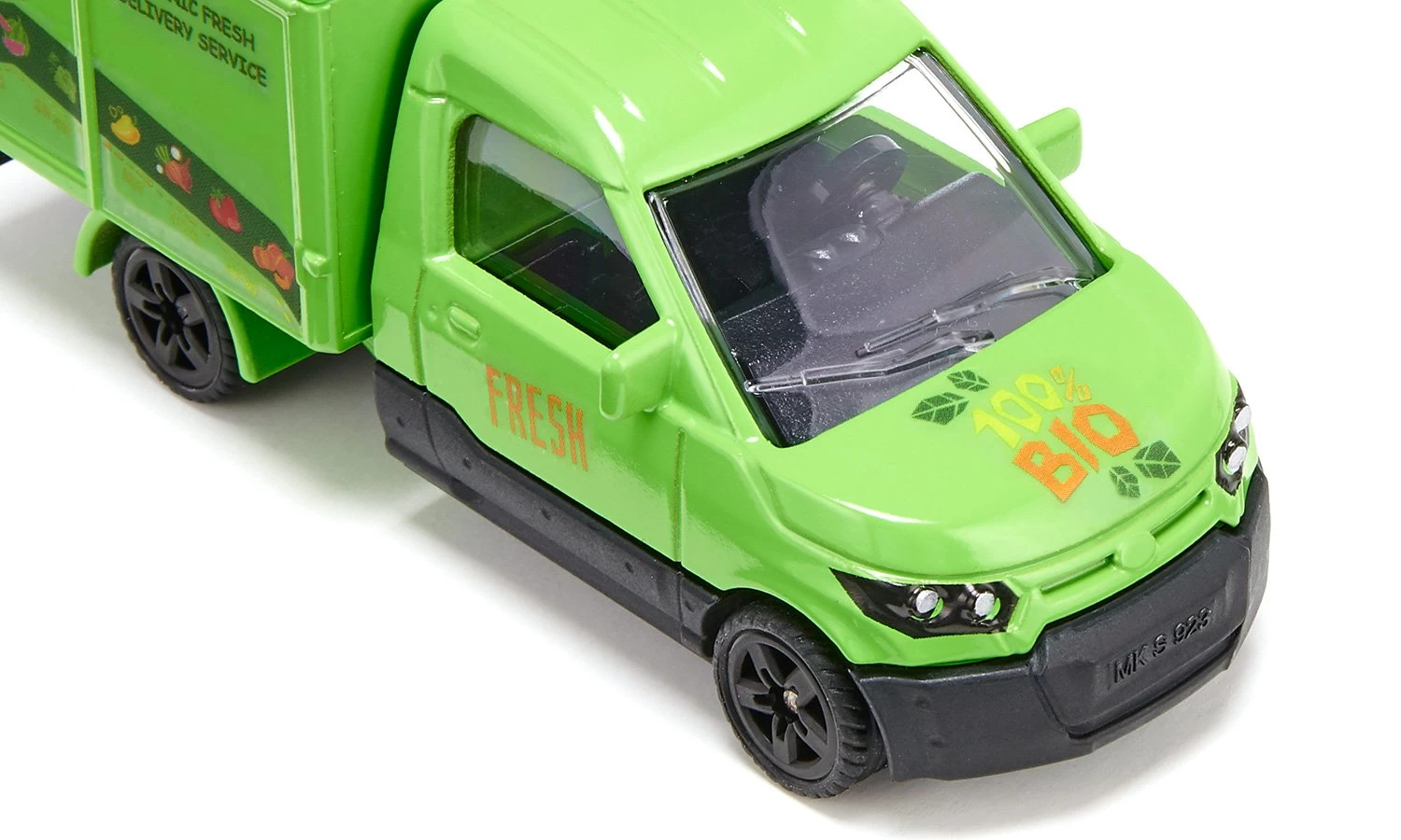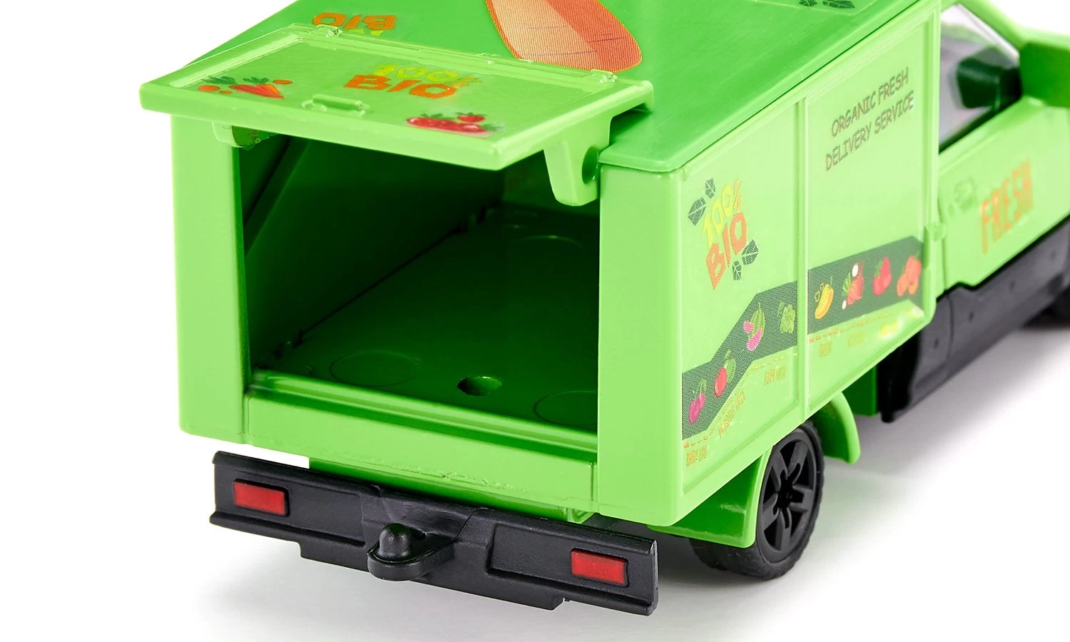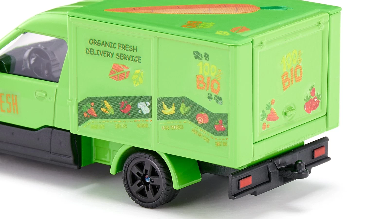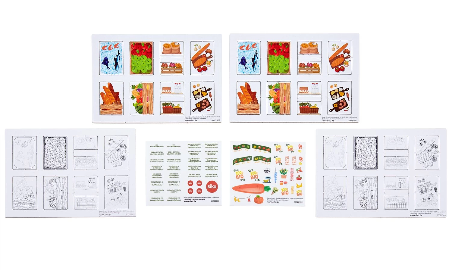 Frische Eier und Milch, knuspriges Bauernbrot, saftiges Obst und knackiges Gemüse direkt von Feld – mit dem BIO Lieferdienst kommen die Lebensmittel direkt an die Haustür in der City. Und nicht nur bei der Ware wird auf die Umwelt geachtet, sondern auch beim Transport. Denn die Auslieferung erfolgt völlig emmisionsfrei mit einem elektrischen Streetscooter. Die Fahrerkabine dieses siku-Modells ist aus Metall, der Aufbau aus Kunststoff. Am Heck lässt sich eine Klappe zum Be- und Entladen öffnen. Der Transporter kann mit den beiliegenden Stickerbögen mit dem Schriftzug „Bio-Frischlieferdienst“ in verschiedenen Sprachen sowie bunten Obst- und Gemüsebildern noch zusätzlich verziert werden. Und weil ein Lieferdienst natürlich nicht ohne die passende Ware auskommt, gibt es zusätzlich noch vier Pappbögen, aus denen vorgedruckte Lebensmittel wie Obst, Gemüse, Eier oder Milch herausgebrochen werden können. Allerdings sind nur auf zwei der vier Bögen die Elemente komplett bunt abgebildet. Die anderen zwei Bögen sind nur mit den Konturen bedruckt, so dass die Kinder selbst kreativ werden und die Lebensmittel nach Lust und Laune bemalen können.