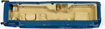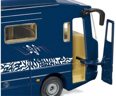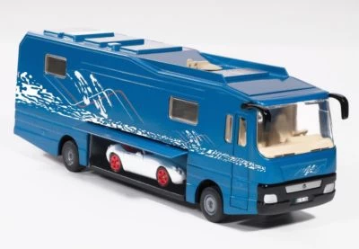 Reisen in seiner absolut luxuriösesten Art bietet das Performance Wohnmobil der Marke Volkner. Die mit hohem Metallanteil 50-fach miniaturisierte Luxuswohnung auf Rädern besticht durch eine Vielzahl von Details. Seitlich öffnet sich eine Klappe und gibt den Blick frei auf eine Mittelgarage unter dem Wohnbereich. Der mitgelieferte Wiesmann Roadster MF5 wird mit dem beweglichen Garagenboden aus dem Wohnmobil gefahren und ist sofort startklar. Dem Vorbild folgend fährt auf der linken Fahrzeugseite das Slide-out heraus, um die Wohnlandschaft im inneren des Modells zu vergrößern. Eine optimale Bespielbarkeit des Modells ist durch das abnehmbare Dach gewährleistet.