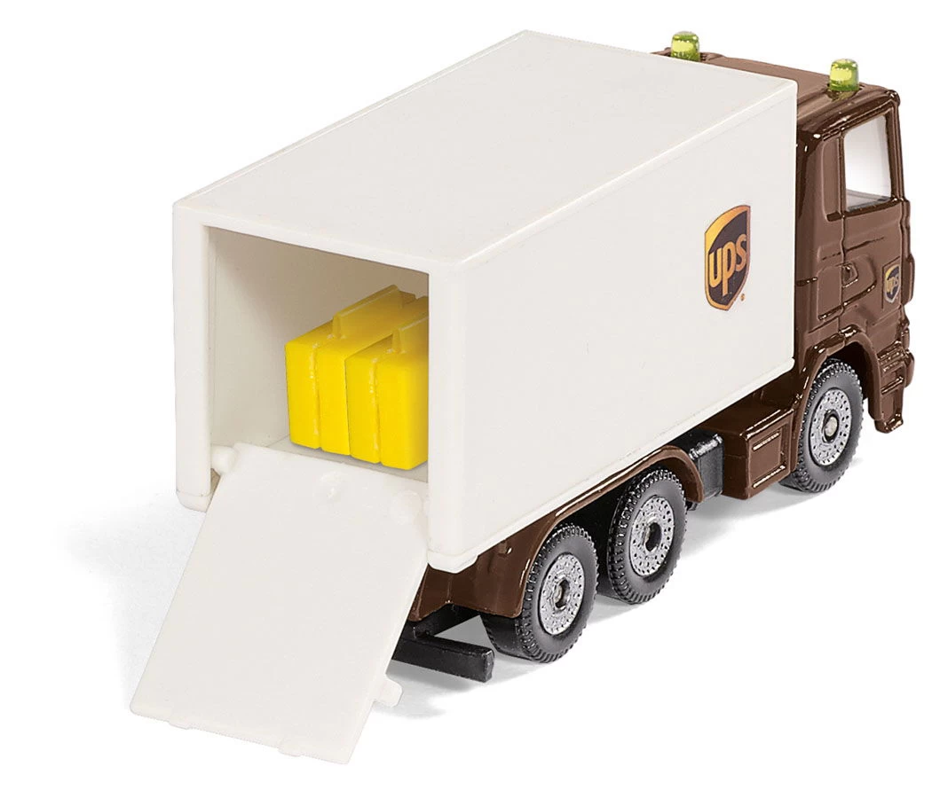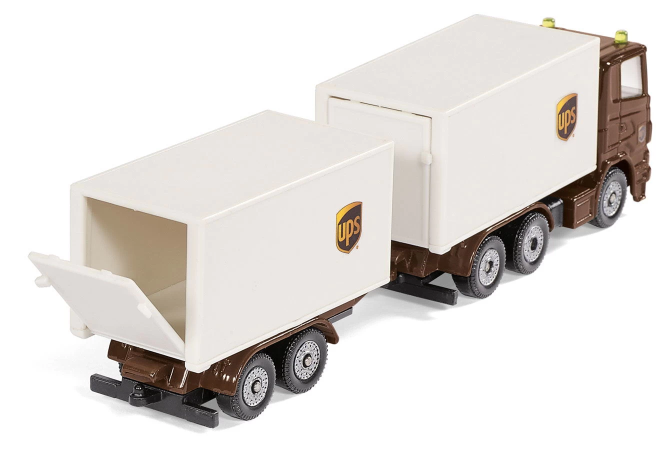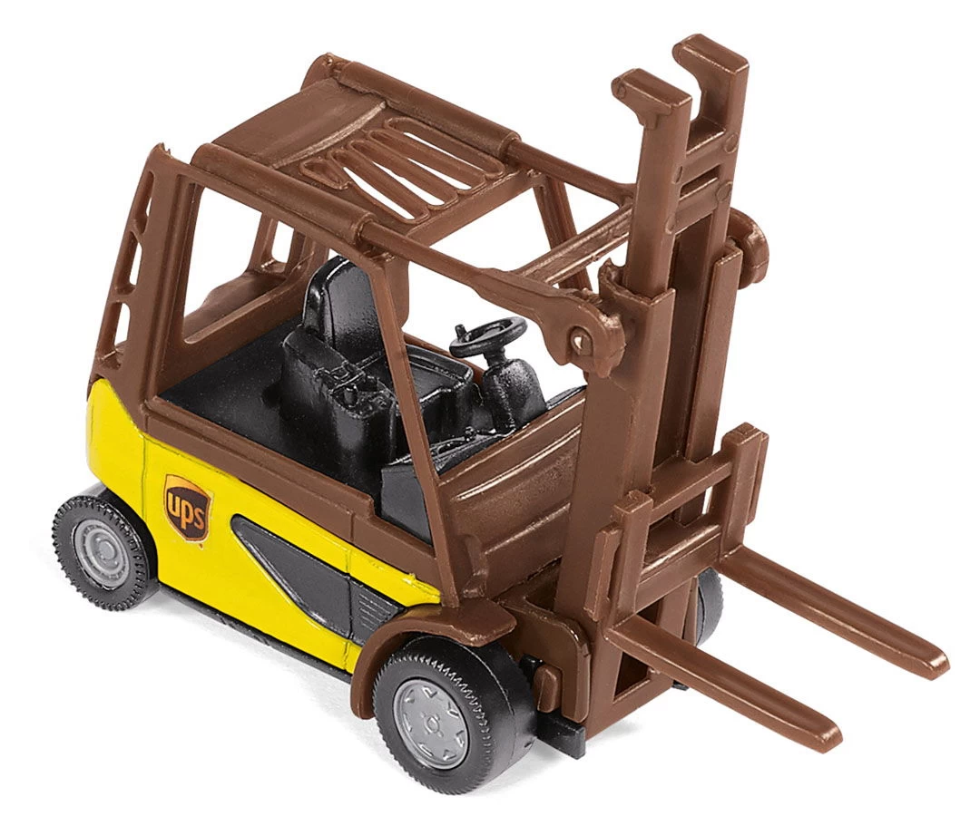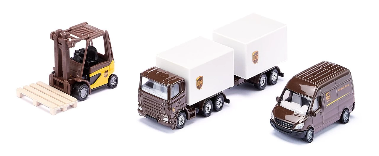 Die braunen Transporter von UPS gehören seit Jahrzehnten zum Straßenbild. Die flinken Paketzusteller springen aus ihren Fahrzeugen und eilen mit der Lieferung zum Kunden. Aber wie kommt das Paket zum Zusteller? Mit dem UPS Logistik Set wird die komplexe Logistik bei der Paketzustellung leicht verständlich und zu einem spannenden Spielthema. Das Set besteht aus einem Gabelstapler, einer 3-Achs-Zugmaschine und einem Transporter in der typischen Farbgebung von UPS. Das Hubgerüst des Linde Gabelstaplers ist beweglich und damit lassen sich die Kofferaufbauten beladen. Dazu können die Heckklappen geöffnet werden. Das Fahrerhaus und die Fahrgestelle der 3-Achs-Zugmaschine und des Zentralachsanhängers sind aus Metall gefertigt. Auch der Paketwagen ist komplett aus Metall gefertigt.