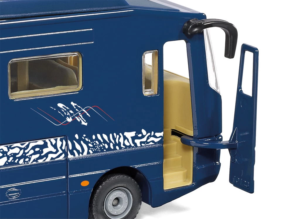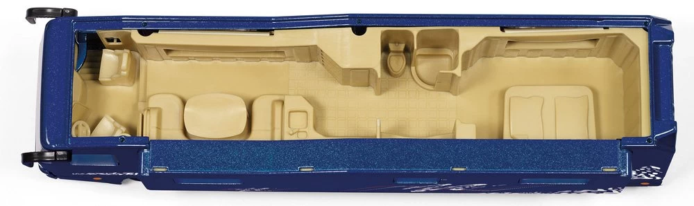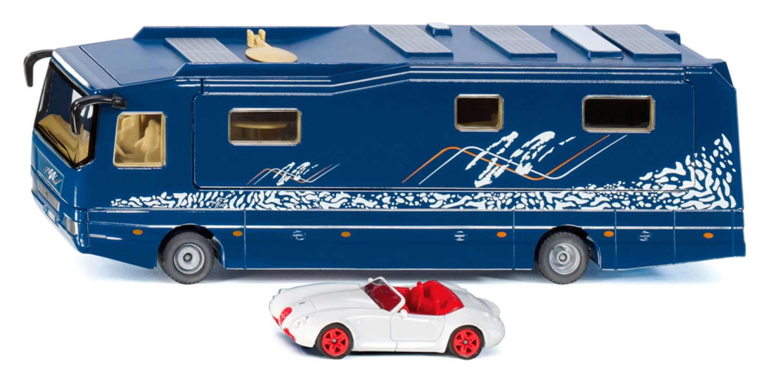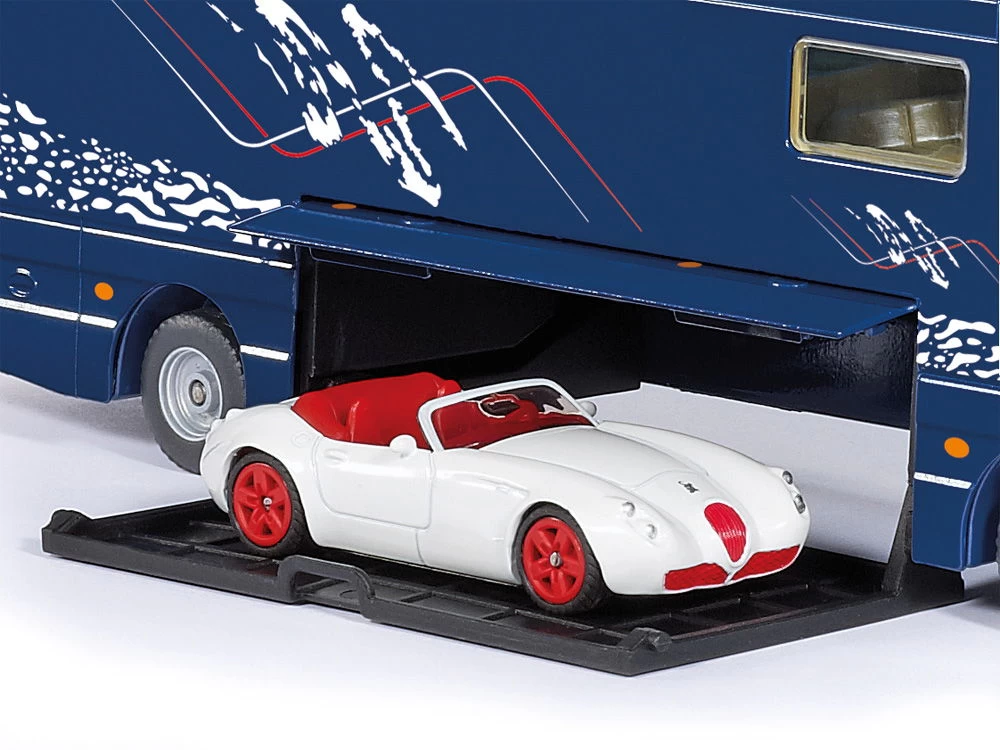 Reisen in seiner absolut luxuriösesten Art bietet das Performance Wohnmobil der Marke Volkner. Die mit hohem Metallanteil 50-fach miniaturisierte Luxuswohnung auf Rädern besticht durch eine Vielzahl von Details. Seitlich öffnet sich eine Klappe und gibt den Blick frei auf eine Mittelgarage unter dem Wohnbereich. Der mitgelieferte Wiesmann Roadster MF5 wird mit dem beweglichen Garagenboden aus dem Wohnmobil gefahren und ist sofort startklar. Dem Vorbild folgend fährt auf der linken Fahrzeugseite das Slide-out heraus, um die Wohnlandschaft im inneren des Modells zu vergrößern. Eine optimale Bespielbarkeit des Modells ist durch das abnehmbare Dach gewährleistet.